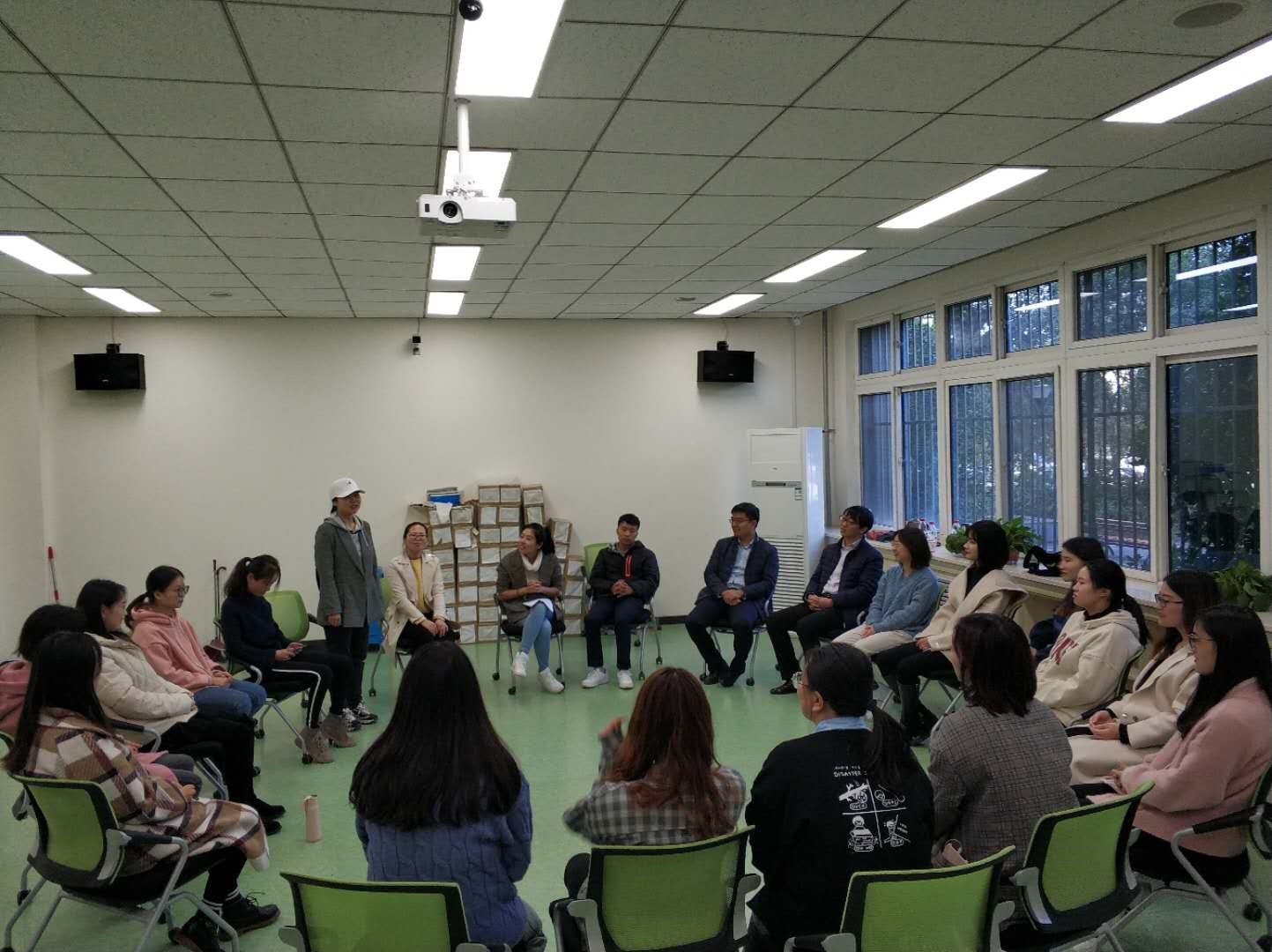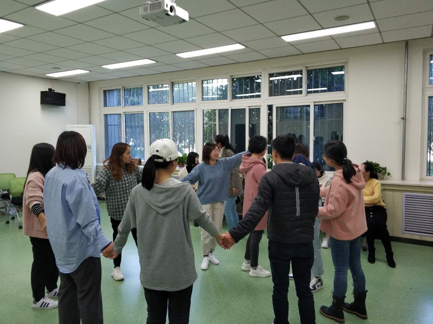 此次“破冰”活动主要分为三个环节:第一个部分是“热身”环节,在戴卓老师的指导下,班级成员各自坐在椅子上围成一圈,左右两边的同学相互把手搭在对方的肩上,来做让对方舒服的动作,最后真挚的向对方说声谢谢。通过简单的活动,大家逐渐放下心理负担,起到了很好的“热身”效果。