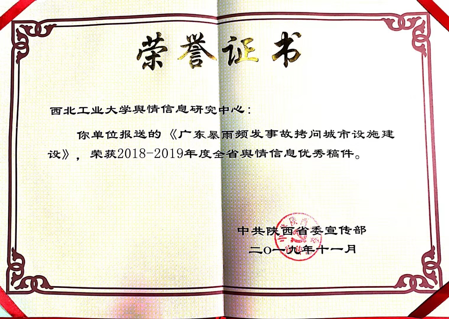 12月12日,2019年陕西省舆情信息工作会议在西安宾馆召开,会议由省委宣传部舆情信息处处长贾永安主持。金年会官网舆情工作表现突出,获得多项荣誉。JINNIAN金年会陕西省重点舆情信息研究中心被评为2018-2019年度全省舆情信息工作先进单位、中心副主任贺苗被评为省级先进个人,她撰写的舆情稿件《广东暴雨频发事故拷问城市设施建设》被评为优秀稿件(全省共30篇),并代表中心进行《着力“四个到位”模式 凝聚舆情工作共识》的主题发言。