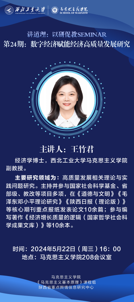 为进一步强化思政课建设与党的创新理论武装同步推进,为新进教师提供教学展示和磨课评课平台,不断加强教学团队内部教学与科研思想的碰撞交流,2024年5月22日下午,金年会官网金年会官网马克思主义基本原理系在院楼208会议室举办第24期“讲道理——以研促教Seminar”。本期主题为《数字经济赋能经济高质量发展研究》,马克思主义基本原理系王竹君副教授做主题分享。