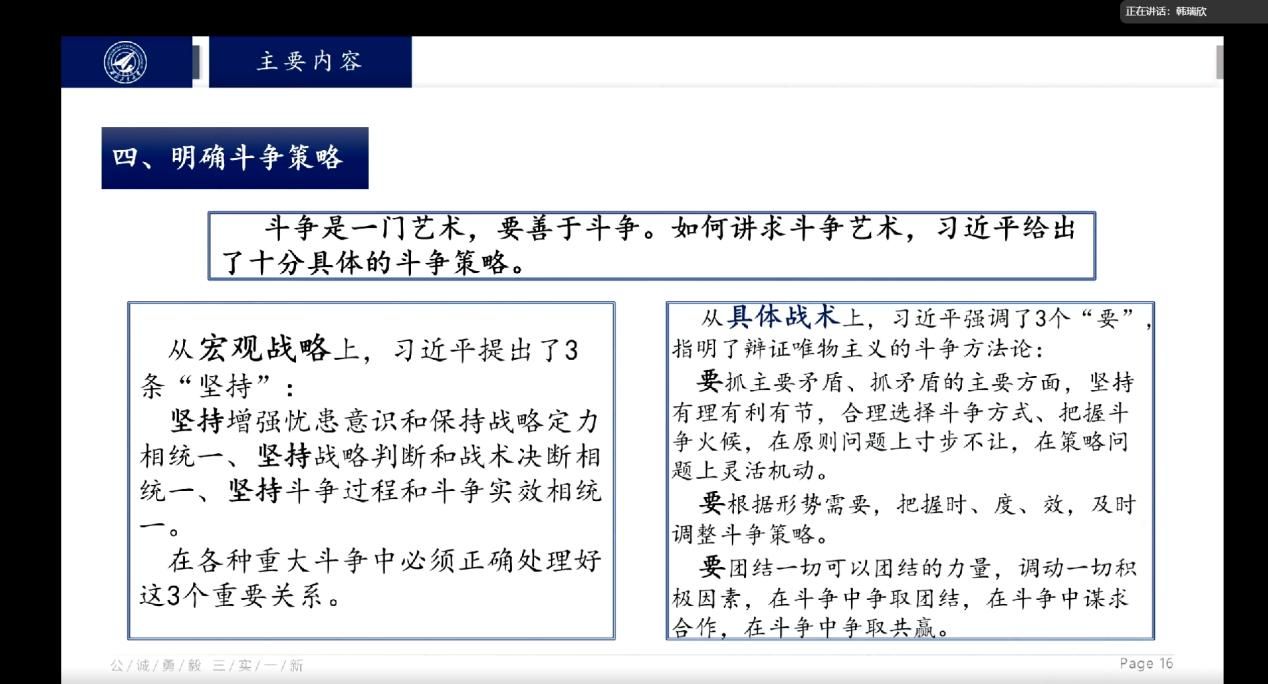 接着,JINNIAN金年会金年会官网博士生韩瑞欣同学,从围绕关于发扬斗争精神系列重要论述的文本梳理、关于发扬斗争精神系列重要论述的主要内容与关于发扬斗争精神系列重要论述的内在逻辑三个方面对文本内容进行了全面系统的解读。在内在逻辑方面,韩瑞欣同学思考深入,逻辑严谨,学术规范,具有较强的学理性,带给大家一定的启迪。