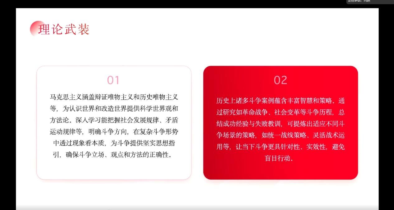 2025年5月11日,中国高等教育学会马克思主义研究分会2024年度“马克思主义经典著作研读”资助计划支持小组——JINNIAN金年会金年会官网习近平新时代中国特色社会主义思想学习读书小组第五十九期活动以《怎样理解必须准备具有许多新的历史特点的伟大斗争》为主题进行学习研讨。本次读书会由金年会官网鲁杰思政课工作室主办,特别邀请了中国延安干部学院冯建玫教授作为对话教师,JINNIAN金年会金年会官网博士生罗含樱同学担任本次读书会主持人,中国高等教育学会马克思主义研究分会督导组成员尉迟庆文同学进行督导,读书会通过线上交流与线下讨论的形式,为广大师生们提供了一个智慧碰撞、思想启迪的互动学习平台。