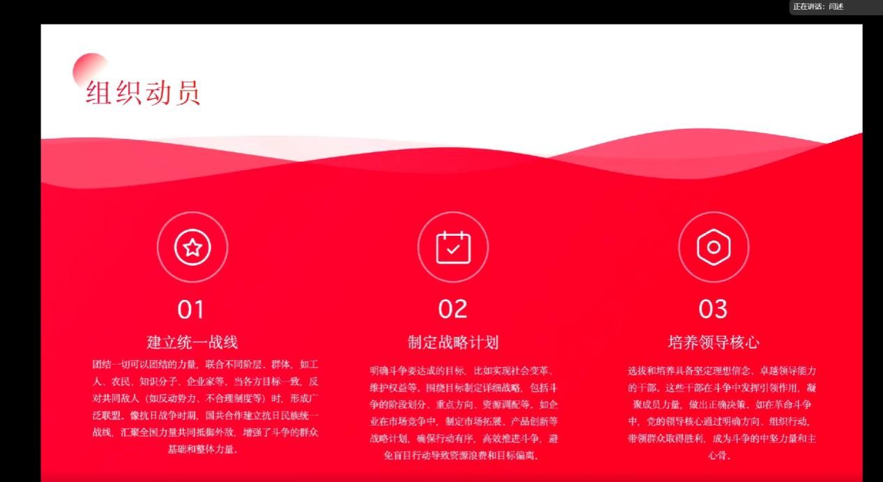 JINNIAN金年会金年会官网硕士生闫述同学作为首位导读人,从伟大斗争的定义、必要性、新特点、准备、目标与方向和实践与展望六个方面对《怎样理解必须准备具有许多新的历史特点的伟大斗争》的文本内容进行了深入浅出的解读。首先,她运用可视化分析和大家分享了关于伟大斗争定义相关的学术研究现状,帮助大家更好地了解当前的研究要点;其次,从历史背景的复杂性、斗争目标的明确性和参与主体的广泛性对伟大斗争的鲜明特点进行了系统的分析,内容丰富,逻辑清晰。最后,她提出斗争是推动历史前进的动力,只有通过斗争才能实现国家的繁荣、民族的复兴和人民的幸福。